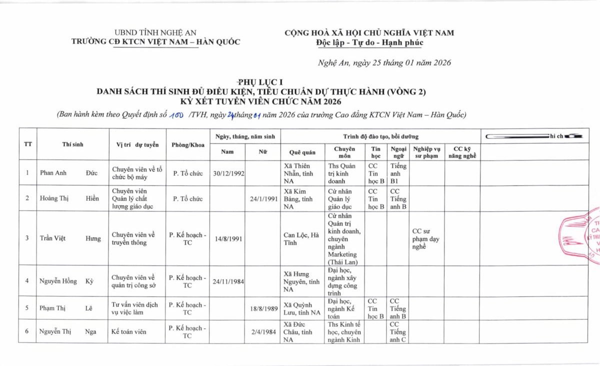 Thông báo, UncategorizedQUYẾT ĐỊNH VỀ VIỆC PHÊ DUYỆT DANH SÁCH THÍ SINH ĐỦ ĐIỀU KIỆN DỰ TUYỂN VÒNG 2 KỲ THI TUYỂN DỤNG VIÊN CHỨC HƯỞNG LƯƠNG TỪ NGUỒN THU CỦA TRƯỜNG CAO ĐẲNG KTCN VIỆT NAM – HÀN QUỐC THÔNG BÁO VỀ VIỆC BỔ SUNG HỒ SƠ TUYỂN DỤNG VIÊN CHỨC HƯỞNG LƯƠNG TỪ NGUỒN THU NĂM 2025 THEO HÌNH THỨC TIẾP NHẬN THÔNG BÁO VỀ VIỆC TỔ CHỨC THI VÒNG 2 KỲ TUYỂN DỤNG VIÊN CHỨC NĂM 2026